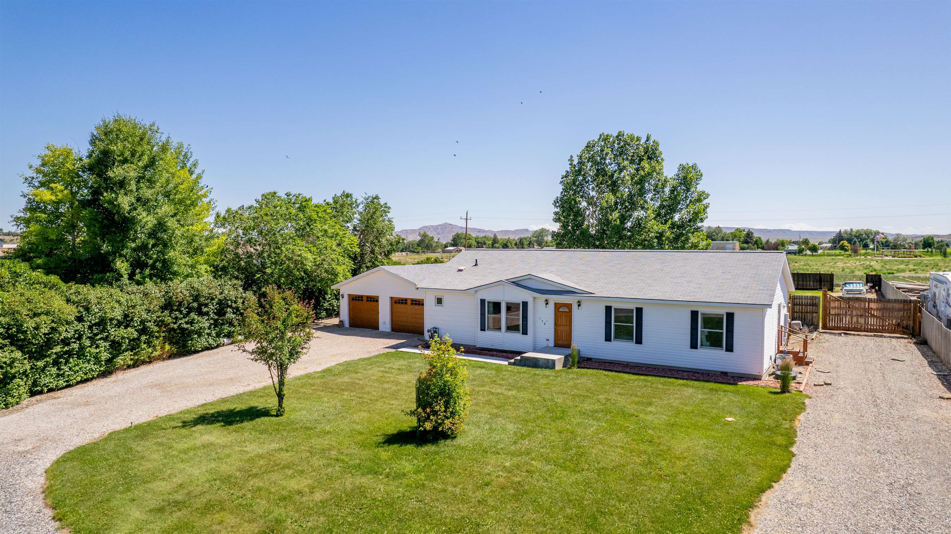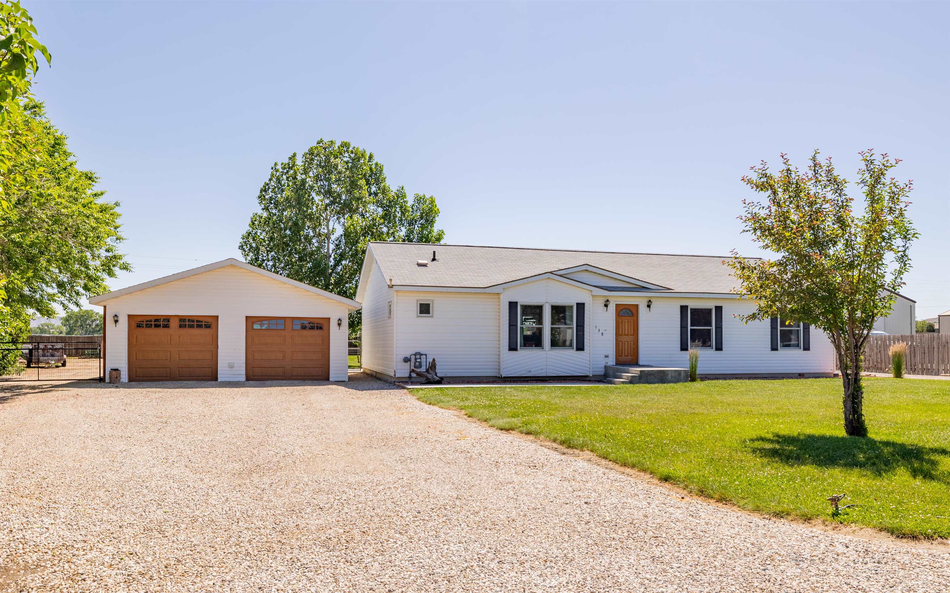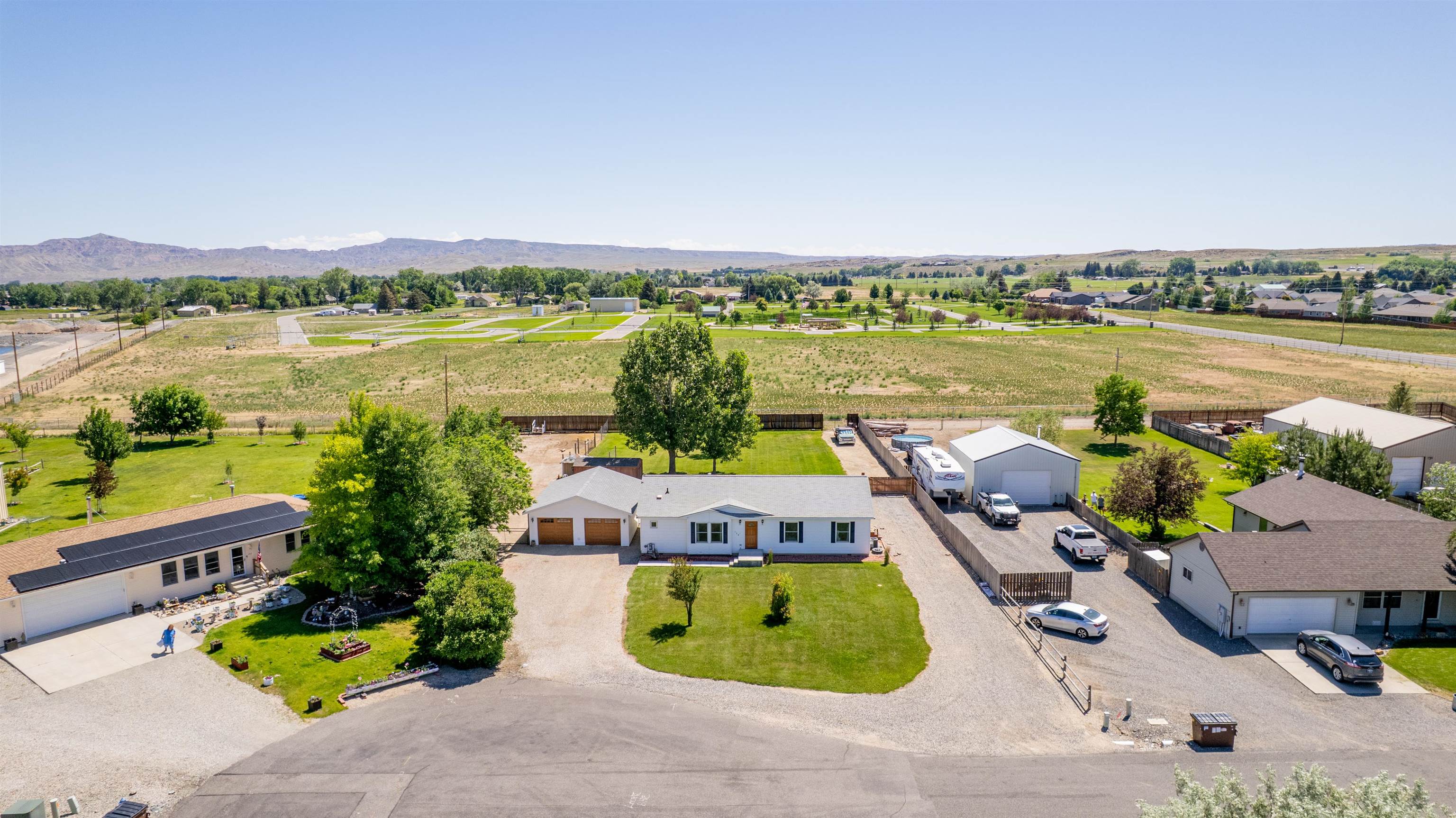 Modern home with vaulted ceilings and high 9' walls. This 3 BR, 2Ba features a detached, oversized garage and a large lot. 0.72 Acre lot with an irrigated yard on a quiet cul-de-sac. Fenced in, private back yard with alley access. Open kitchen with gas range, wood cabinets and modern appliances. Upgraded electrical to support and large water heater and a 50/30 RV plug in on the exterior. Large two car Garage is finished and wired with cable and phone hook up. Beautiful, private back yard with plenty of space for an additional shop building. Gravel drive for RV parking with exterior plugin. Additional gravel drive to safely store equipment.