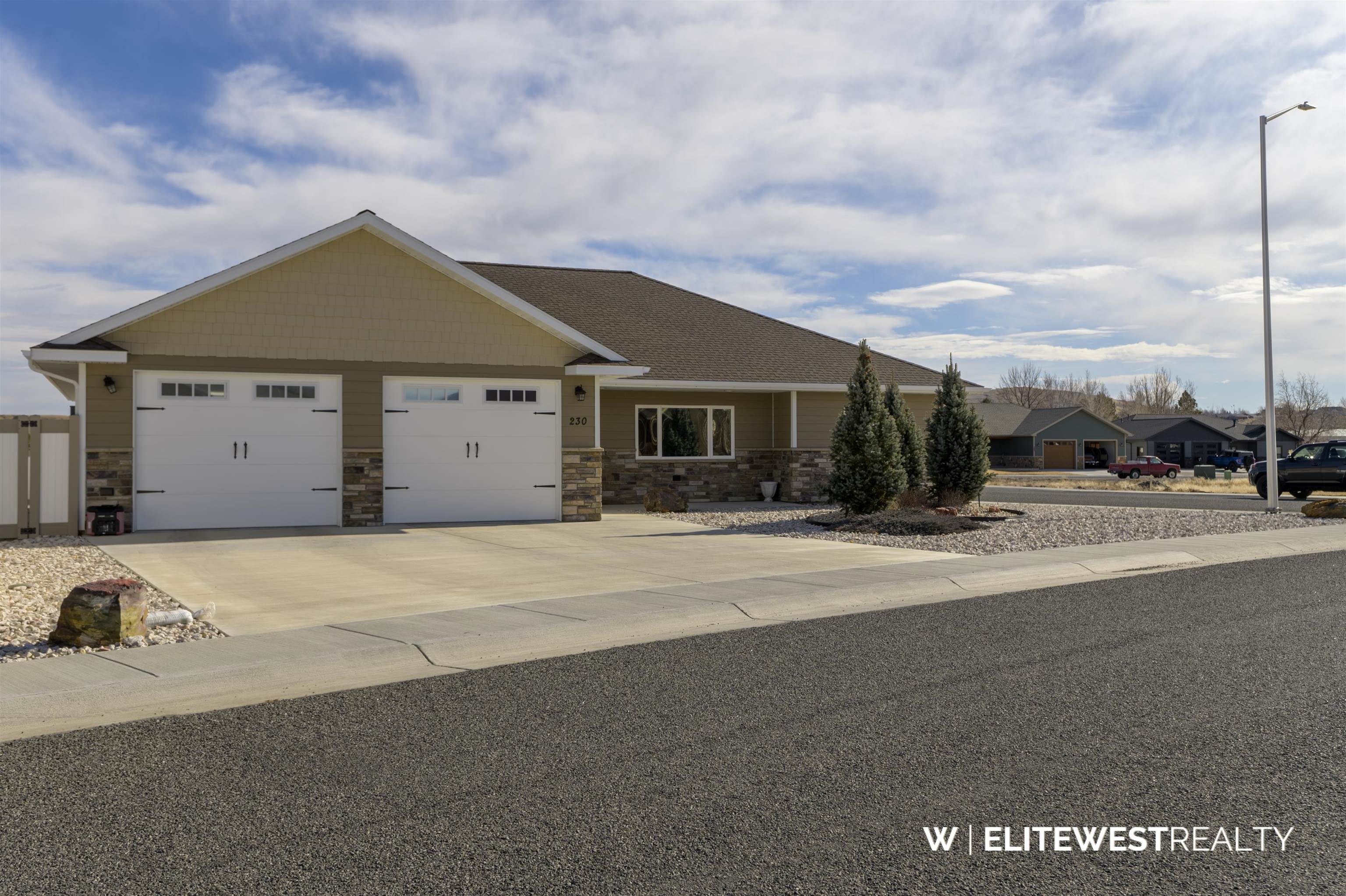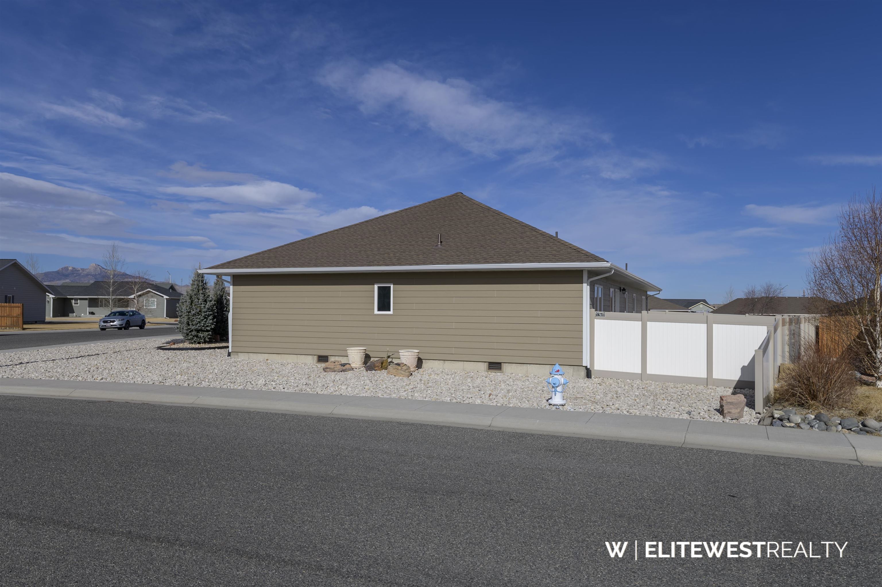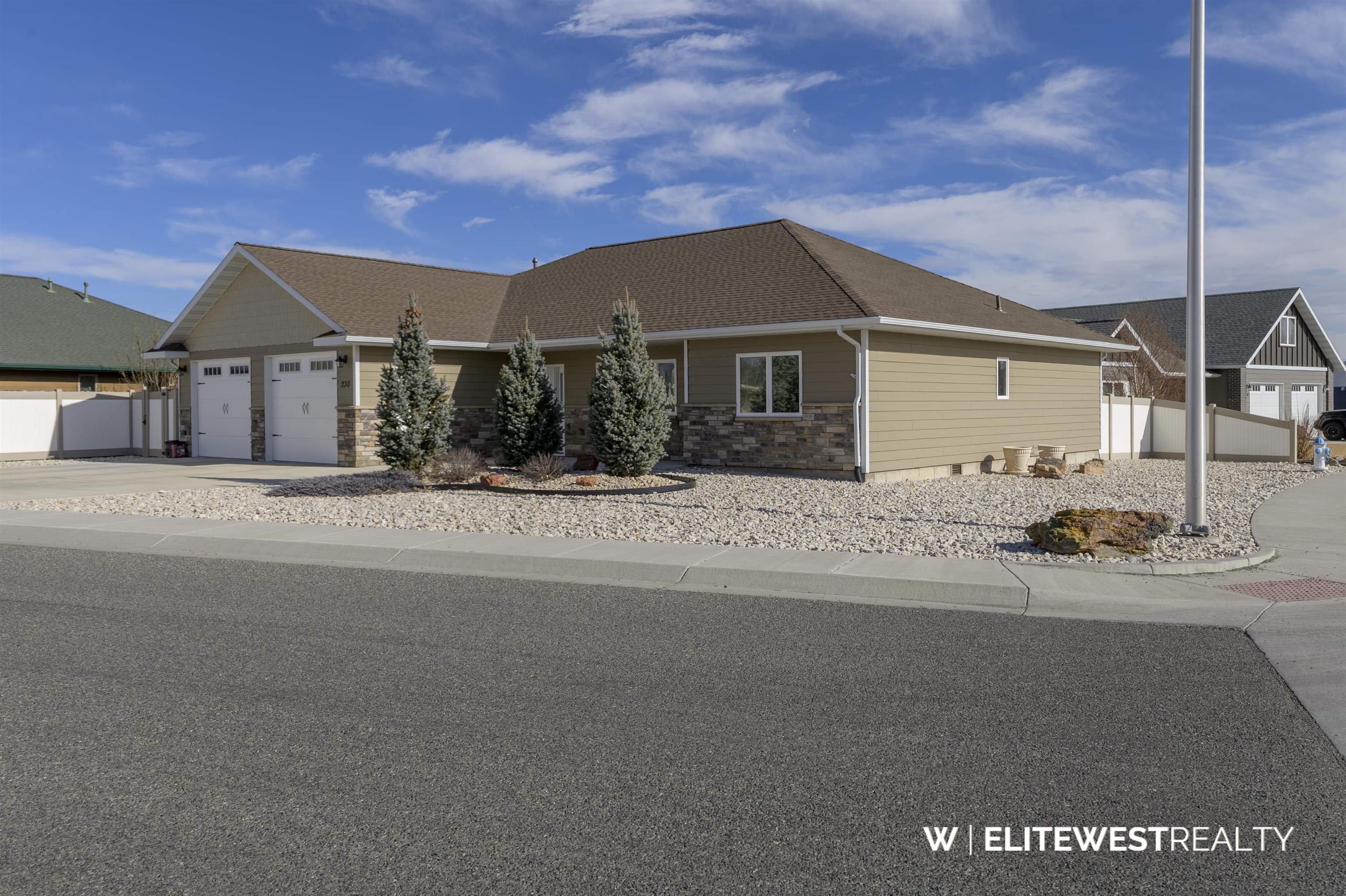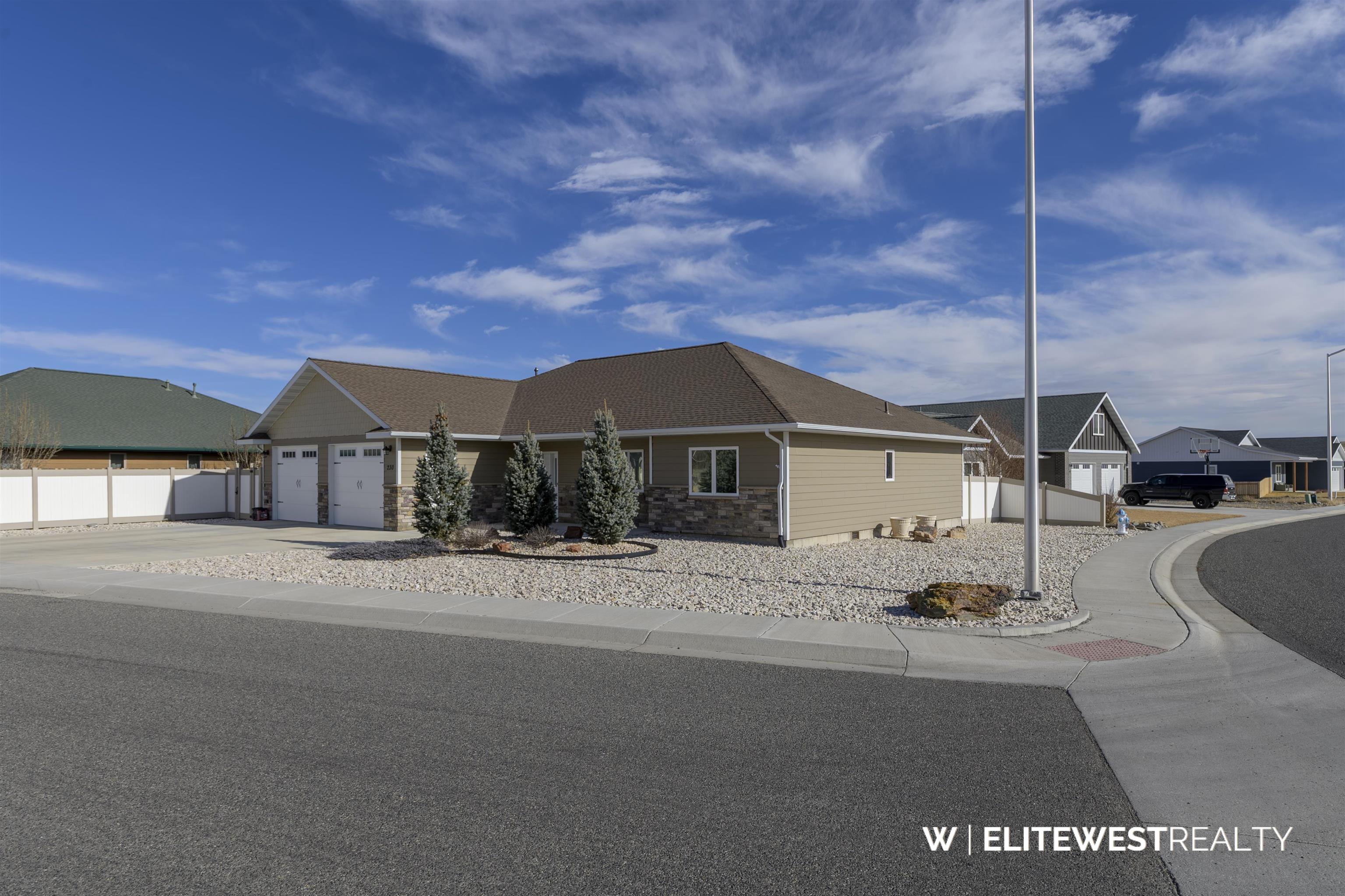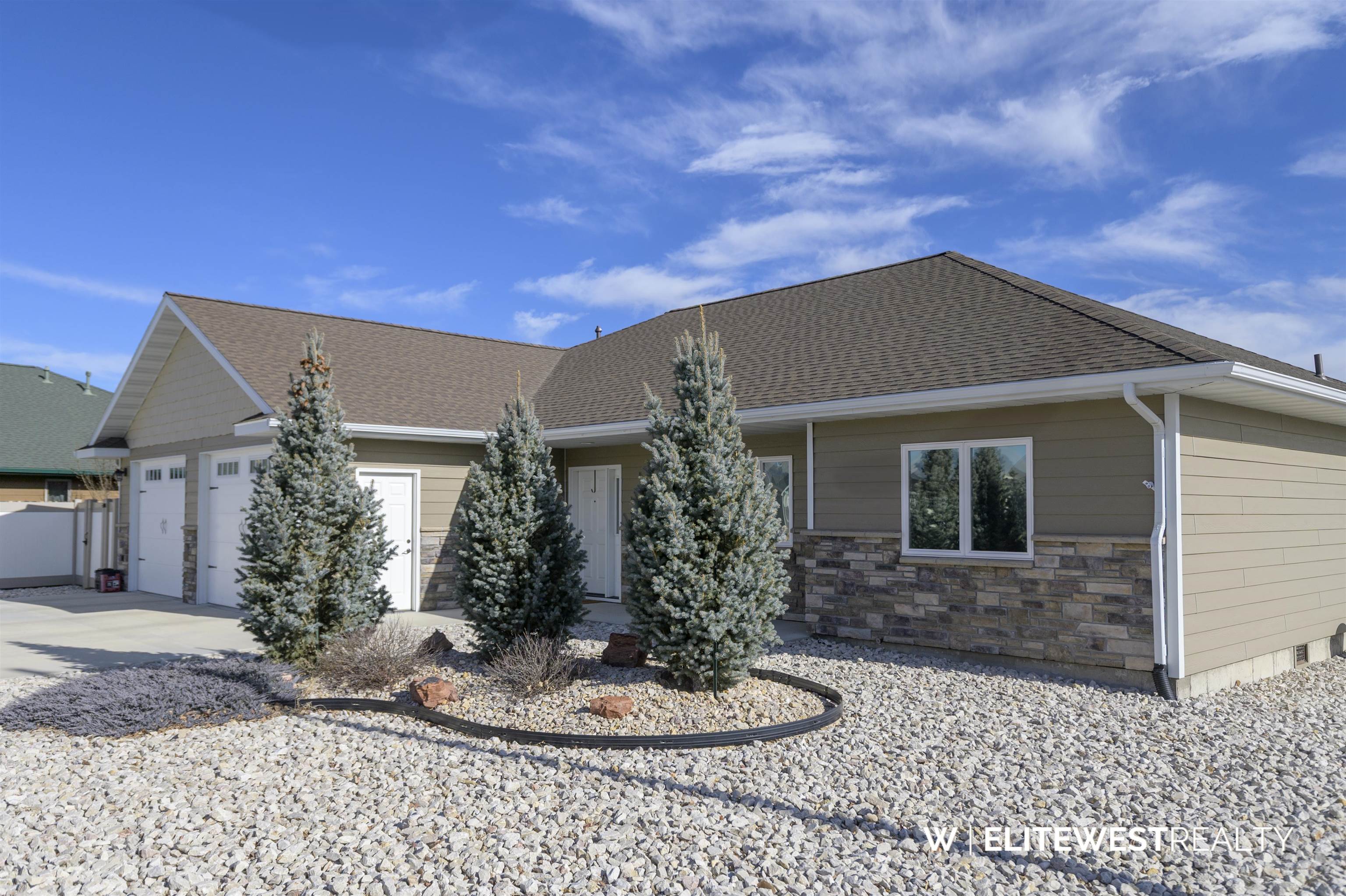 Exquisite custom home thoughtfully designed for comfortable Wyoming living. Vaulted ceilings highlight the great room, creating a bright, open space ideal for relaxing or entertaining. The kitchen features custom hickory cabinetry with LED under-cabinet lighting, a large walk-in pantry, and sleek all-black stainless steel appliances. High-efficiency heat and central air provide year-round comfort, complemented by solid core doors with upgraded hardware, and ceiling fans in every room. Nine-foot ceilings enhance the spacious feel throughout the home. An oversized garage and wide driveway offer excellent functionality. Outside, enjoy a low-maintenance, zero-scaped rock landscaped lot with automatic drip irrigation to trees and shrubs; perfect for weekends spent enjoying Wyoming instead of mowing. Quality craftsmanship, efficiency, and easy upkeep come together in this beautiful custom home.